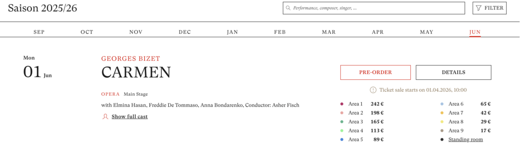 第一步就是先確認演出曲目與場次。最直接、也最準確的方式,就是透過歌劇院的官方網站查詢節目表。網站上可以依照月份查看當月的所有演出,包含歌劇、芭蕾與其他音樂會類型,每一場演出也都會清楚標示日期、時間與演出內容。