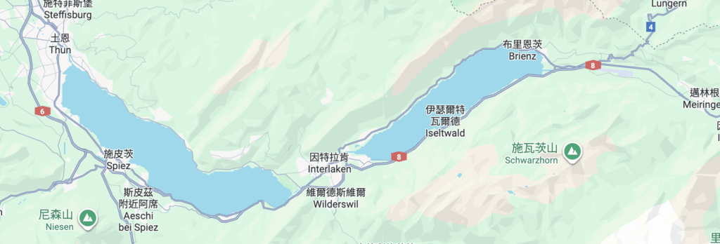 除了住在車站附近之外,其實因特拉肯整個城鎮範圍並不大,從東站 (Interlaken Ost) 步行到西站(Interlaken West) 大約只需要 20 分鐘。顧名思義,因特拉肯 (Interlaken) 在德文中就是「兩湖之間」的意思,指的正是小鎮位於布里恩茨湖 (Brienzersee) 與圖恩湖 (Thunersee) 中間的地理位置。因此,如果不打算住在車站周邊,也可以選擇往東靠近布里恩茨湖,或是往西接近圖恩湖,這些臨湖的小鎮與度假區,都能帶來更清幽、悠閒的氛圍,非常適合想遠離喧囂跟自駕的旅人。
