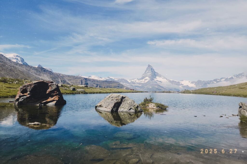 Stellisee 是整條健行的經典代表,天氣晴朗時能清楚倒映出整座馬特洪峰的山形,那畫面幾乎像明信片一樣完美,當下親眼看到真的會忍不住讚嘆。